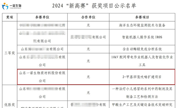 山東省工業(yè)和信息化廳公示2024年“山東制造·齊魯精品”名單,山東一諾生物質材料股份有限公司的“糠醇”產品入選。
